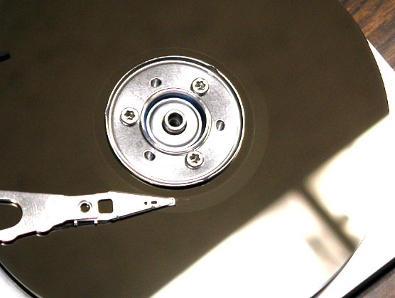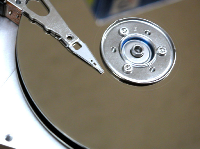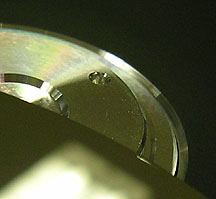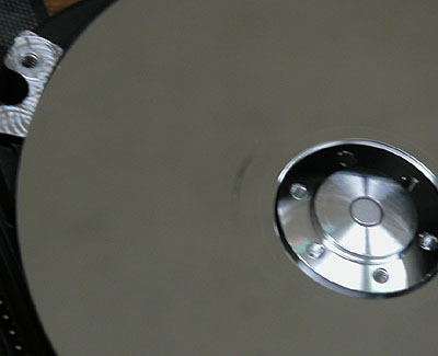 | 蛍光燈を反射させて、すこしコントラストを調整してみました。これで見える? 内周のクランプよりやや外側にうっすらと白い土星の輪の様な帯が見えますね。 ヘッドが発進&着地する場所は内周部のホームポジションだけです。 その部分に表面加工(細かい傷を入れておく)してあり白く見えます。 傷はヘッドが吸着するのを防ぐ為です。 以前は全面にこの様なレコードの溝みたいなのを入れていましたが、記録密度を上げるには平坦な表面が好まれるので、その加工を局部的にする様になりました。 この様な内周部の帯は、人為的に作っただけでなく、ヘッドがこすれて削れて摩耗した場合も帯になります。でもそういう場合はヘッドの幅と同じになるのですぐにわかります。これは太い線ですから加工跡ですね。 |