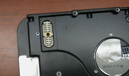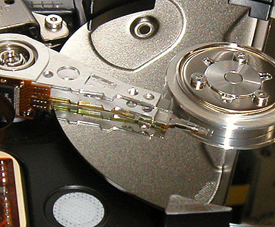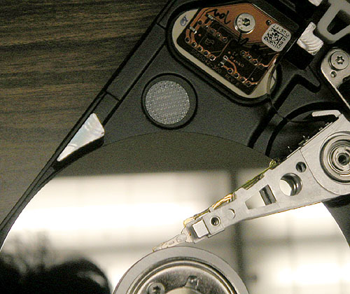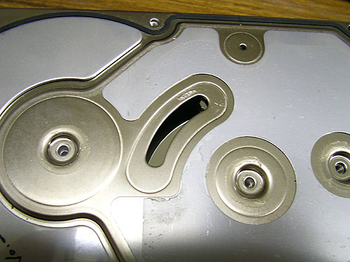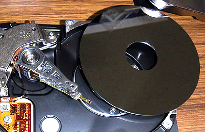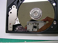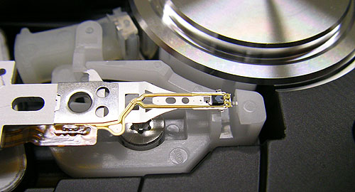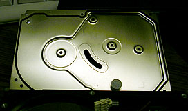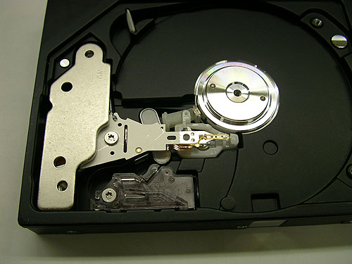 | 中です。これも一枚です。40Gが1枚だったから、10Gが1枚でももう驚かないぞ! 構成はSeagateとほぼ同じです。 ディスク面も全体がポリッシュ仕上げで中央付近にヘッドのスティック防止用の加工がされています。 Seagateのドライブと違っているのは、ヘッドのロック機構がついていたことでしょうか。 下の写真のディスク面で左下のピョンと出ている黒いひげ。これが、ディスク回転が始まると風を受けて右側に押されます。右に押されるとヘッドがフリーになります。押される前はヘッドをがっちり固定して下の写真位置から動かない様になっています。 回転しはじめと停止は必ず最内周で行うのを徹底させてますね。もしくは非通電時の振動などでヘッドが動くのを嫌っているのかもしれません。 |