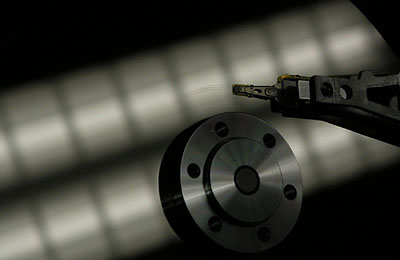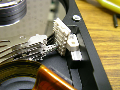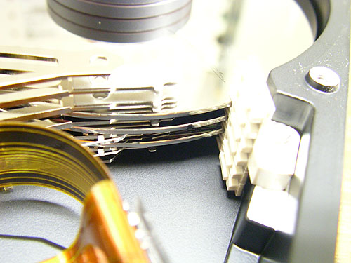 | 回転させても回転数が上がらないので、ちょっと様子を見てみました。どうやらヘッドが外周部に行くと回転が下がる様子。 認識できないもんだから、内―外―内―外の繰返しでアームがカッコンカッコン言ってます。 試しに・・・そのヘッドロックを外して内周部(CSSゾーン)以外の場所にもってくると、いきなり吸着(スティック)して動かなくなりました。下の写真みたいな感じ。 写真は吸着した状態です。くっついてしまてってはもうディスクも回りません。もちろん手で回そうとするとヘッドが破壊されます。 写真の様に、ヘッドをちょこっと持ち上げてやると、次の次の写真の様にホームポジションに戻ることができます。 |
