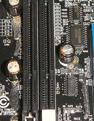 先に説明しておくと、かなり加熱されてました。 PCケースのすき間というすき間にホコリが詰まっていて、排気ファンは回転しているものの空気は流れない状態でかなり加熱されていたと思います。 M/Bの電解コンデンサーの電解液が加熱されてそれぞれのパーツから吹きだしているのがわかります。 そんな日が続き、とうとうHDDがBIOSで認識されなくなりました。 そういうモノでした。 |