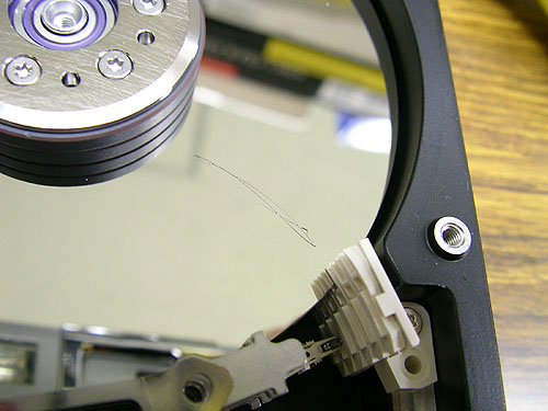| この傷は使用中についたとは思いにくいものです。ちょっと深いですし、短いですから。回転と共についたとも思えないし、停止時にはヘッドは内周に固定されているし。 ディスクの使用中はデータ面を下向きに配置して使っていましたのでゴミが落下するのもないと思います。 |
