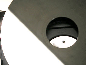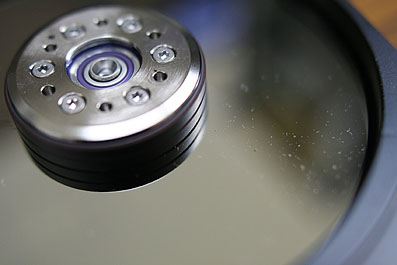 | 気持ちを切替えて、実験です。 ドライブの筐体を、ドライバーなどで、コンコン、とたたく。 するといとも簡単にディスク面に傷ができます。 見えますか? 中央のクランプの下に4つの点が写ってますね。写っている蛍光燈は、その反射位置がここでないと傷が写真に写らないので無理とそうしています。気にしないで下さい。 やや右上にも同じものがみえるのは、2箇所で試したからです。 コンコンとされたときにヘッドが(見えない程度に)跳ねて、そのエッジが傷を作った跡です。 こうなるとすぐ壊れますから注意して下さい。 |