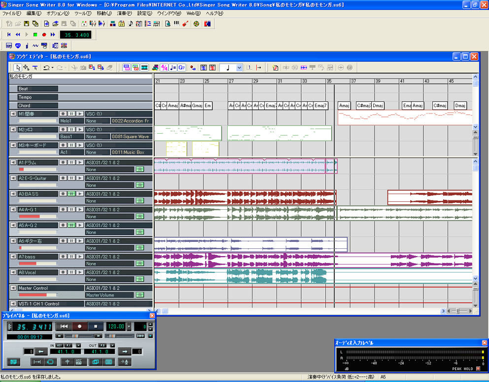 まず。MIDIでスコア入力して、それにあわせてベースをアナログで録音して、更にエレキでサイドギターを録音して、アコースティックを重ねて・・・って簡単に多重録音の出来上がり。