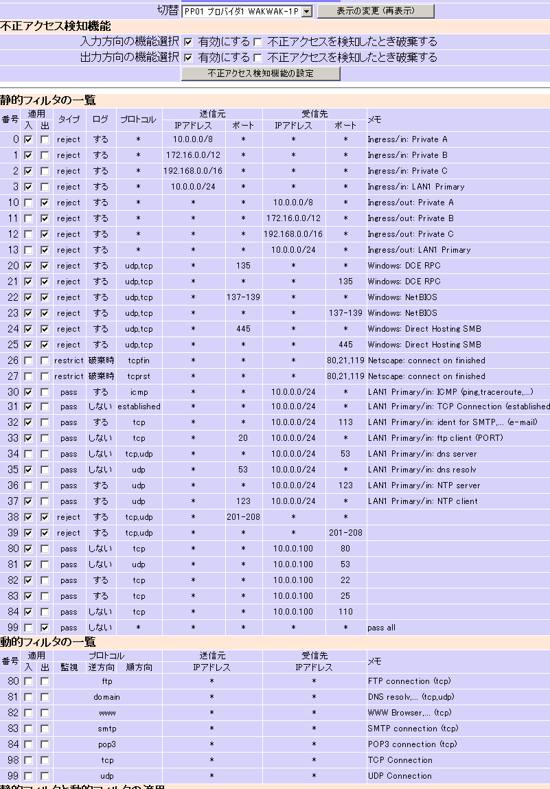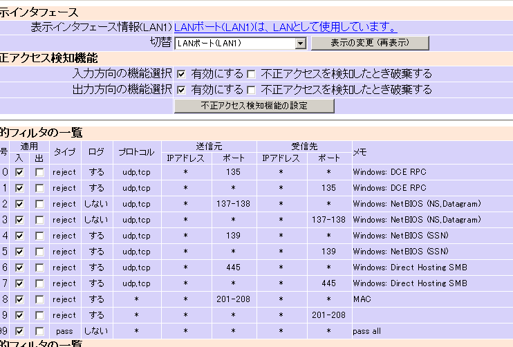 あとは tcp,udp それぞれについて、LAN内のWindowsのNetBIOSに関するパケットが流出しない様に137,138,139 をフィルタリングしておきました。